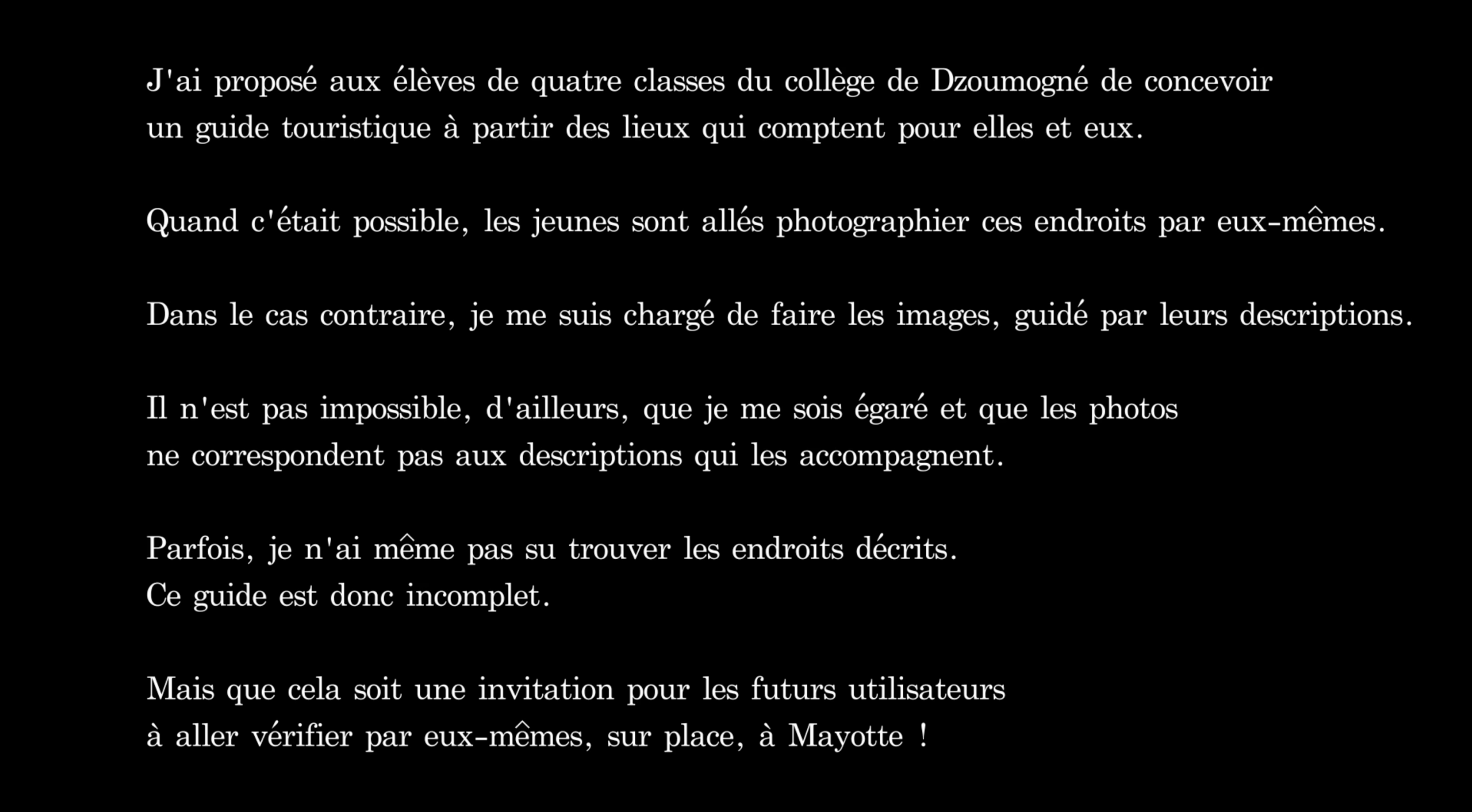 Film réalisé dans le cadre d’un atelier mené avec les élèves de quatre classes du collège Bakari Kusu de Dzoumogné (Mayotte). Les élèves ont été invités à décrire des lieux qui comptent pour eux. Puis nous sommes allés les photographier, en vue d’élaborer un guide touristique alternatif à ceux qui existent déjà.